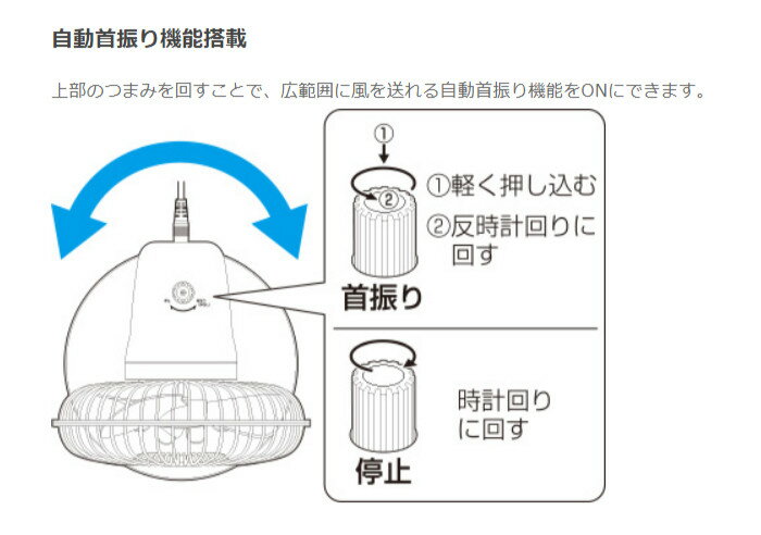 ※本体から10cmの位置で測定 ■自動首振り機能搭載 上部のつまみを回すことで、広範囲に風を送れる首振り機能をONにできます。
