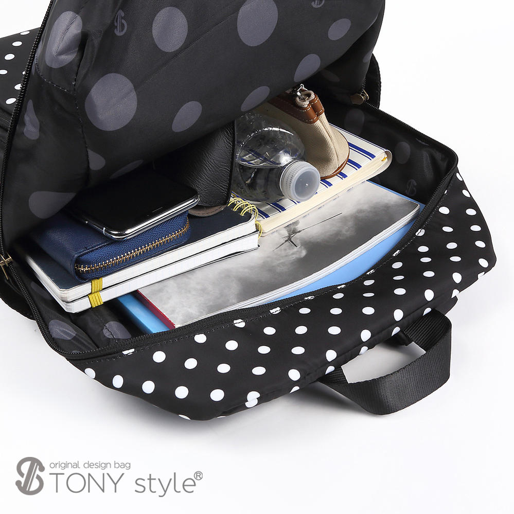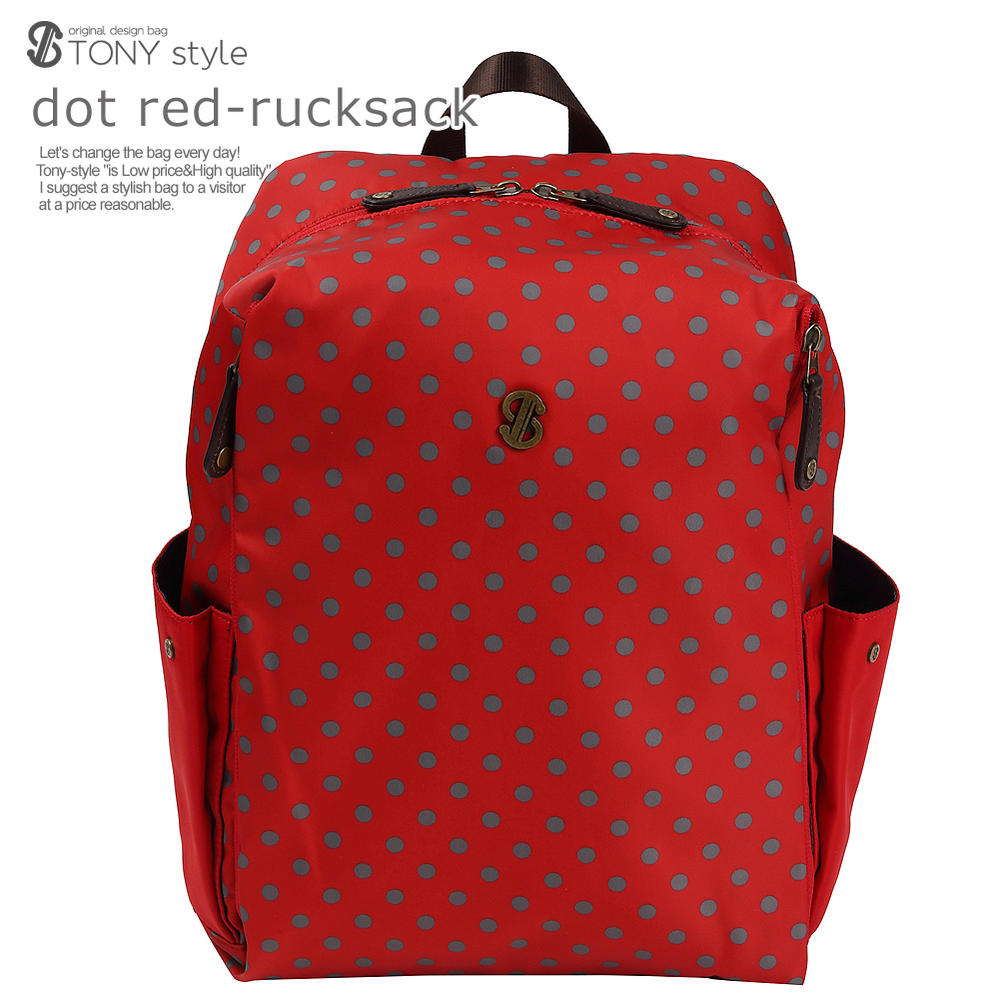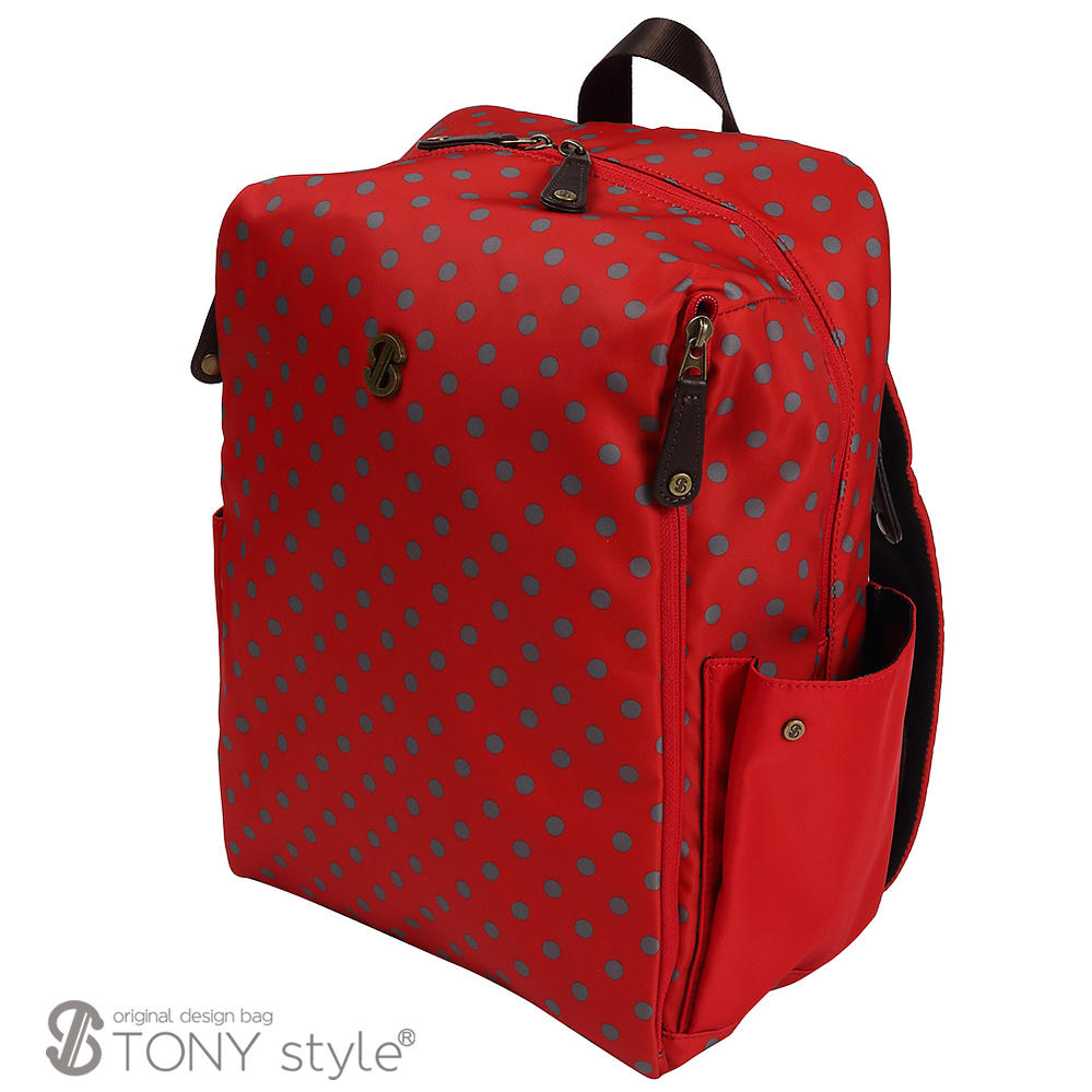 【TONYstyleオリジナルバッグ】レトロドットスクエアライトバックパック<レッド>赤色 水玉柄 ドット柄 軽量リュックサック バックパック 多機能ポケット